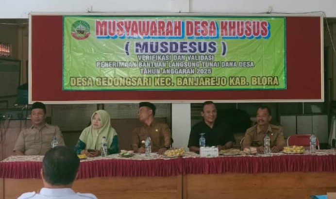Acara MUSDESUS ini dilakukan di Kantor Desa Gedongsari dan diikuti oleh Kepala Desa beserta perangkat desa, Ketua BPD, RT, RW,Tokoh masyarakat dan perwakilan dari kecamatan Banjarejo Kabupaten Blora.